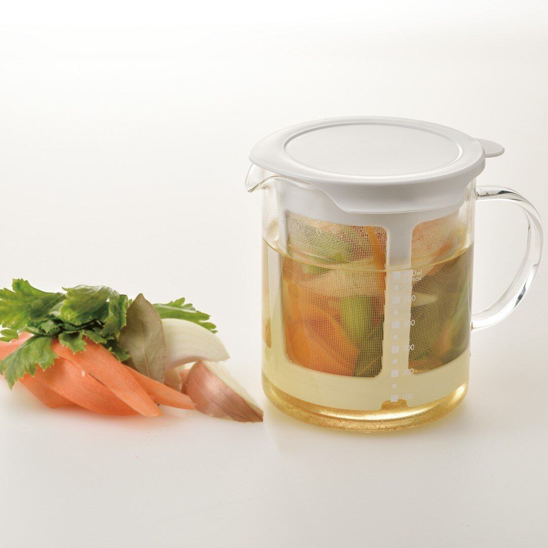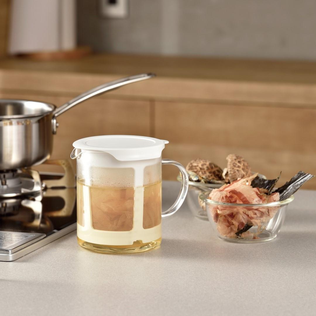 また、ポットの底まで届く大きなストレーナーはだしをしっかり抽出。しかも、 ストレーナーのへこみ部をポットの淵に引っ掛けて、最後の一滴まで無駄なく抽出できるような設計が素晴らしい。